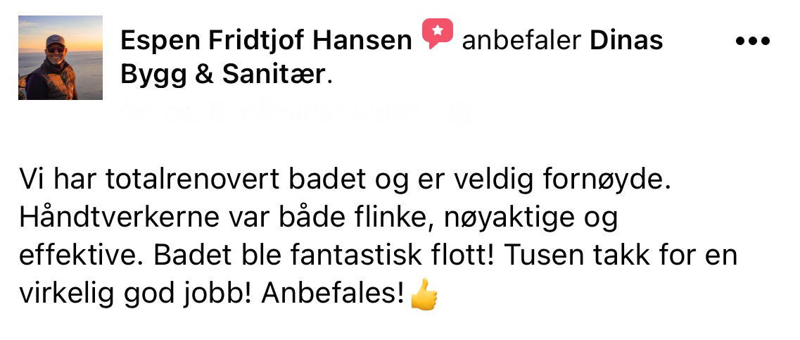 Her viser vi bilder fra noen av våre oppussingsprosjekt. Det er av bad, vaskerom, stue og oppholdsrom. Og vi trekker fram et par referanser, og du kan lese flere på Facebooksiden vår.